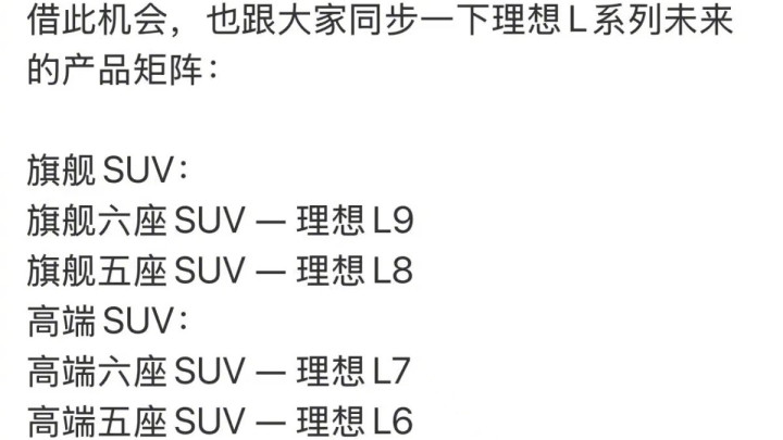 理想接下来的新产品谱系结构是,旗舰SUV板块里,理想L8打5座市场,理想L9打6座市场,高端SUV版块里,理想L6打5座,理想L7打6座。