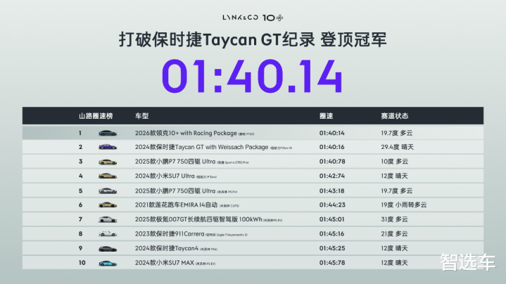 与此同时,领克首次以“+”之名打造的极致运动座驾领克10+,联合领克汽车运动的赛道级调校并在官方性能套件的赋能下,领克10+ with Racing Package以1分40秒14的山路圈速成绩超越保时捷Taycan GT,取得亚洲山脊赛道圈速第一并登顶“弯道之王”,进一步强化了领克在纯电运动领域的引领地位。