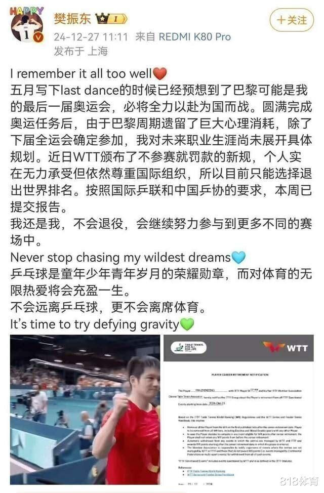 2024年12月27日中午,樊振东在社交媒体上宣布退出世界排名,但不会退役!樊振东表示,自己在巴黎奥运会圆满完成任务后,由于这一周期有巨大心理消耗,尚未展开未来职业生涯规划。但是近日WTT颁布了不参赛就罚款的新规,个人实在无力承受但依然尊重国际组织,所以目前只能选择退出世界排名。